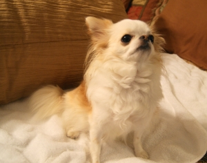 Cream & white Long Coat Izzy is retired. She’s the resident baby sitter at Cathy’s house. She welcomes every puppy that needs a warm body to cuddle with. She enjoys her cuddle time snuggled up with her mommy and daddy too.